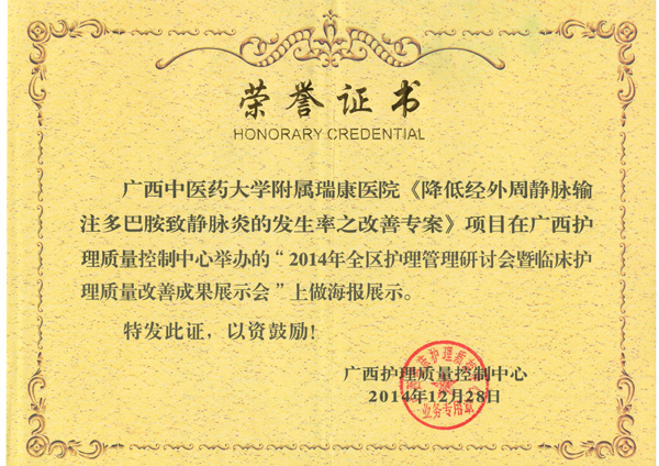 2014年12月27日至28日,由广西临床护理质量控制中心举办的“2014年全区护理管理研讨会暨临床护理质量改善成果展示会”在南宁市凤凰宾馆召开。全区共有58项护理质量成果参与本次展示会,遴选出的16项成果单位在会上作汇报发言,另42项成果以海报形式展示。我院开展了近三年的护理品管圈活动,在此基础上有两个项目脱颖而出,护理部在大会上做了汇报发言和海报展示——《提高结肠镜检的肠道清洁效果之改善方案》和《降低经外周静脉输注多巴胺致静脉炎的发生率之改善专案》,受到与会专家组和全区护理同行们的一致好评。