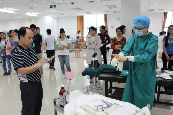 2015年4月16日,以“传承感恩,诚信创新,博学强览,蓄势待发”为主题的瑞康临床医学院第九届临床技能大赛在广西中医药大学明秀校区图书馆医学教育实训中心成功举行。大赛旨在提高我院学生的综合素质,进一步激发同学们的学习兴趣,营造浓厚的学习氛围,提高同学们的临床实践能力和自主学习能力。大赛评委由瑞康临床医学院杨靖、李日东、朱寿鸿、朱志华、陈威、蒋媛静等老师及参加第六届全国高等医学院校大学生临床技能竞赛华南区分区赛的队员担任,2011级204位同学均参加了比赛。