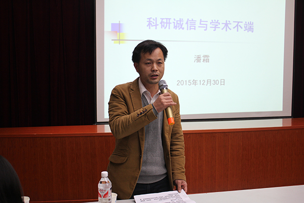 随后,潘霜副处长作了《科研诚信与学术不端》的专题讲座,他从广西中医药科研基本情况、科研学术不端的典型案例、学术不端的定义、产生学术不端的原因以及如何防范科研学术不端五个方面做了详细介绍,对“五不准”的内容逐条进行解释。