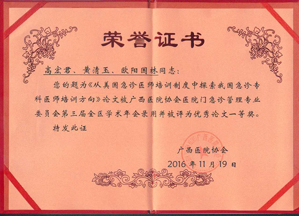 大会收集到学术论文近50篇,我院论文《从美国急诊医师培训制度中探索我国急诊专科医师培训方向》(高宏君、黄清玉、欧阳国林)荣获优秀论文一等奖、《季节变化对门诊就诊量影响的分析》(韦东)获二等奖、《门诊老年冠心病患者实施健康教育的探讨》(于秀婷)获三等奖。