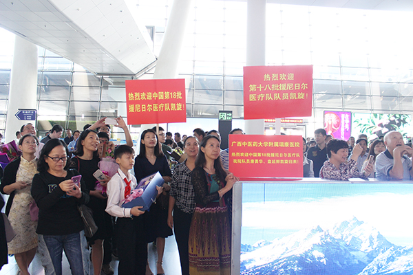 11月22日下午5时,经过两年的艰苦工作,我院泌尿外科盘延鲜副主任医师和眼科唐勇华副主任医师圆满完成各项工作,随中国第18批援尼日尔医疗队安全飞抵家乡南宁。医院党委副书记、纪委书记陈日兰,副院长高宏君率领人力资源部工作人员和家属一道来到机场迎接两位专家。