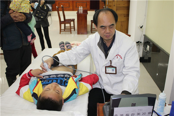 3月5日至8日,我院联合广西青少年发展基金会、共青团梧州市委分别到蒙山县、藤县、岑溪市和长洲区开展“共青团助力脱贫攻坚——2017年如新中华儿童”义诊公益活动。我院韦思尊副院长、心胸外科杨柳山主任以及我院先天性心脏病专家团队全程参与本次活动。为疑似先天性心脏病的患儿进行免费普查,为已接受先天性心脏病手术的少年儿童进行免费复诊。活动期间共筛查219名患儿,其中确诊需要手术77人,29人待进一步检查,113人属于复诊或者未患病。这些患儿大多数来自农村和城镇的贫困家庭,年龄最小的两个月,最大的17周岁。