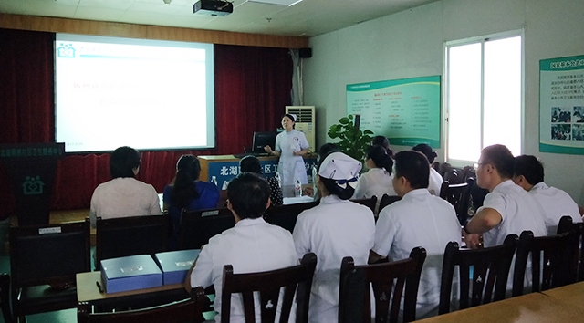 首先林何梅护士长向专家组介绍了我社区卫生服务中心的发展史,教学硬件和软件设施,护理教学师资水平以及社区护理教学工作的开展情况,同时表示一定会积极配合完成护理学专业认证工作。