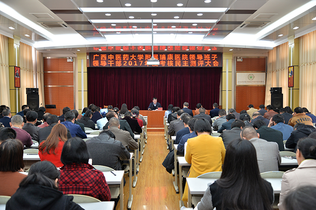 按照学校党委《关于做好我校中层领导班子、领导干部2017年度考核工作的通知》要求,1月17日下午,我院在B座十楼会议室召开领导班子和领导干部2017年年度考核民主测评会议,学校团委书记王春花,团委办公室主任、社会实践部部长陈晓东组成考核组到会指导,医院党委书记高宏君,院长唐友明,党委副书记、副院长陈日兰,副院长庞刚、韦思尊,党委副书记、纪委书记黄建民,副院长陈锋以及医院中层正职干部代表、正高级职称专业技术人员代表、医务人员代表163人参加会议。唐友明院长主持会议。