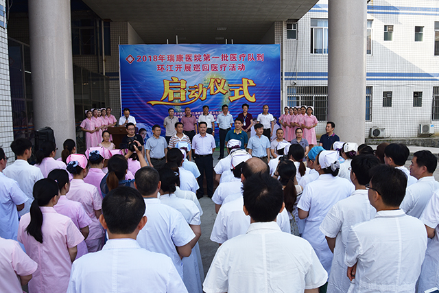 活动启动仪式在环江县人民医院门诊一楼举行,环江县人民政府党组成员、副县长覃红灯代表环江县四家班子领导及38万人民群众对我院巡回医疗队的到来表示热烈的欢迎和感谢。他表示,环江毛南族自治县是国家级贫困县,医疗卫生基础薄弱、人才严重匮乏、管理体制滞后、信息建设落后等因素严重制约了自治县卫生事业的发展。瑞康医院专家团队前来开展疾病诊疗、健康宣教、技术支援、管理指导等巡回活动,将为自治县医疗机构不断提高技术水平和服务能力、提升人民群众的健康水平起到很好的带动作用。