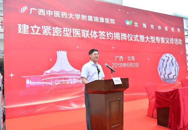 北海市委常委、宣传部部长、副市长黄江在仪式上说,广西中医药大学附属瑞康医院和北海市中医医院“紧密型医疗联合体”的成立,是北海市医疗卫生计生工作走“联大靠强”的道路开展医疗集团工作的具体体现,是北海市医疗战线上的一件大喜事,对深化北海市医疗体制改革,加快北海市医疗卫生事业发展,先进医疗技术、管理理念由上而下沉淀,保障民生医疗服务需求的渴望,都将起到积极的推动作用。