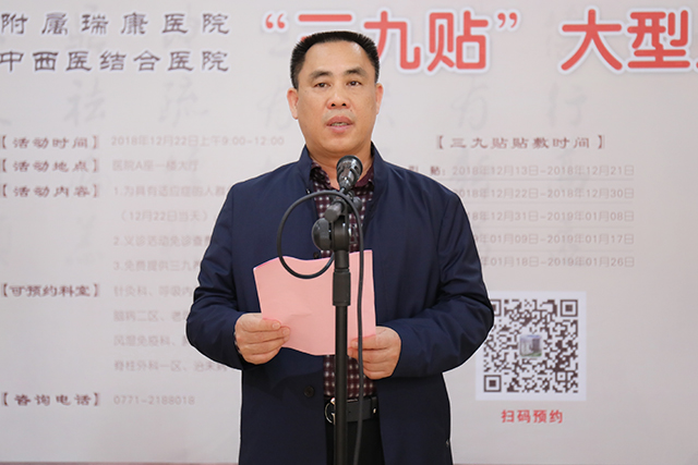 冬日的邕城温暖依旧,瑞康的温情感动持续,12月22日冬至时节一大早,为普及冬季养生知识,改善人民群众体质,展现中医药文化,我院在A座一楼门诊大厅举行“冬病冬治,改善体质——广西中医药大学附属瑞康医院免费贴敷‘三九贴’义诊活动”,治未病中心、针灸科、呼吸内科、脾胃病科、脑病一区、脑病二区、老年病科、儿科、妇科、产科、风湿免疫科、肿瘤三区、耳鼻喉头颈外科、脊柱外科一区等14个科室医护人员现场为800余名群众免费贴敷“三九贴”之一九贴。医院院长唐友明,党委副书记、副院长陈日兰,副院长陈锋出席活动开幕式。