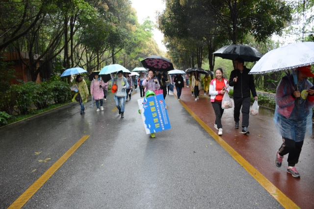 随后,唐友明院长宣布比赛开始,一声令下各参赛队员纷纷出发。在雨中,参赛队员们雨衣雨伞全副武装,不惧风雨,或一人领先冲锋陷阵,或拖家带口结伴而行,大家一边朝终点进发,一边欣赏秀丽的自然风光,一路上欢声笑语。