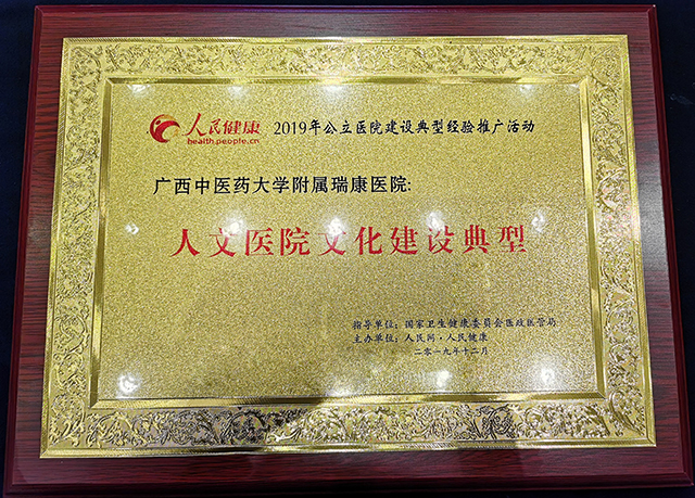 我院充分挖掘医院近70年发展历史的深厚文化底蕴,提炼出医院宗旨、医院精神、医院定位、办院方向、服务理念等核心价值体系,积极推进医院文化建设,大力倡导“自强不息、团结拼搏、敢为人先”瑞康精神,有效提升了医院的凝聚力和战斗力。医院文化建设取得的突出成绩获得大会评审的认可,在参评的全国400多家三甲医院中脱颖而出,荣获“人文医院文化建设典型”奖。