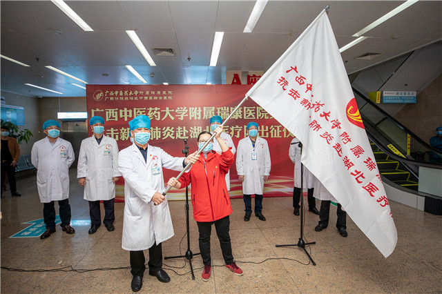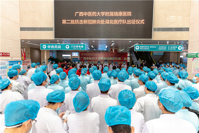 14:30,医院党委书记高宏君,院长唐友明,党委副书记、副院长陈日兰,副院长庞刚、韦思尊,纪委书记黄建民,副院长陈锋、宋策及相关职能科室负责人、队员家属和科室同事为18位驰援湖北的勇士举行了简短而庄严的出征仪式。副院长韦思尊主持出征仪式并宣读医院第二批驰援湖北医疗队队员名单。
