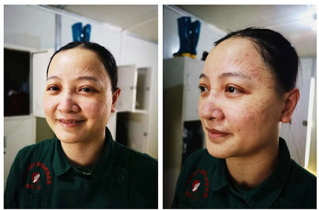 长时间戴着护目镜,唐晓脸上留下的印痕