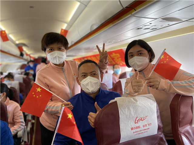 “五星红旗迎风飘扬,胜利歌声多么响亮……”飞机上,广西医疗队员们唱起赞歌。