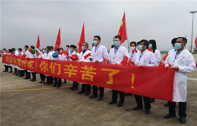 阔别月余之后,再见家乡亲人,顺利凯旋的广西医疗队员们显得格外开心。
