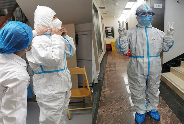副院长韦思尊先给两位队员讲解了国家最新版诊断标准的注意问题,并了解了队员的心理及应对压力和准备情况,接着感染管理科科长黄妮妮对两位队员进行了穿脱防护用品的实地培训考核,在反复穿脱防护用品的过程中不断对细节问题进行优化,同时,前线的援鄂医疗队也进行了经验分享,互相沟通交流,最大程度防止污染,保护自身的安全,确保圆满完成任务。