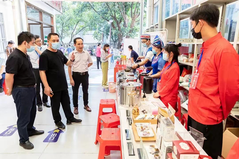 在比赛如火如荼进行的同时,比赛场外的中药壮瑶药食养食疗产品展也人声鼎沸。我院展区摆出了数十种医院自主研发的中医药特色药膳食品,不仅有药膳奶茶、药膳果冻、药膳糕点、养生茶、养生酒等,还有现场制作的药膳油茶,吸引了许多人驻足参观品鉴,现场十分热闹。