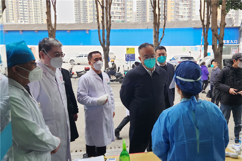 黄俊华副主席一行先后来到医院本部、南棉社区卫生服务中心实地查看发热门诊设置情况、进院诊疗流程、核酸检测点运行情况等,与医务人员进行交流。医院领导详细汇报了“新十条”落地后,医院发热门诊科学设置、区域划分、医药物资储备、医护人员配备、医疗设备保障和就诊流程等情况。