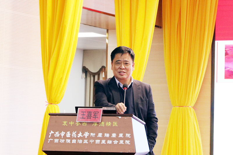 1月17日,国家重点学科中药学学科带头人、黑龙江中医药大学王喜军教授莅临我院授课。广西中医药大学副校长冷静、成果转化与社会服务处处长唐红珍、学科建设办公室主任吴林出席活动。我院党委书记高宏君,院长唐友明,党委副书记、副院长陈日兰,副院长韦思尊,纪委书记黄建民,副院长陈锋以及全体中层干部,各临床、医技、门诊科室等职工在B座十楼聆听讲学。