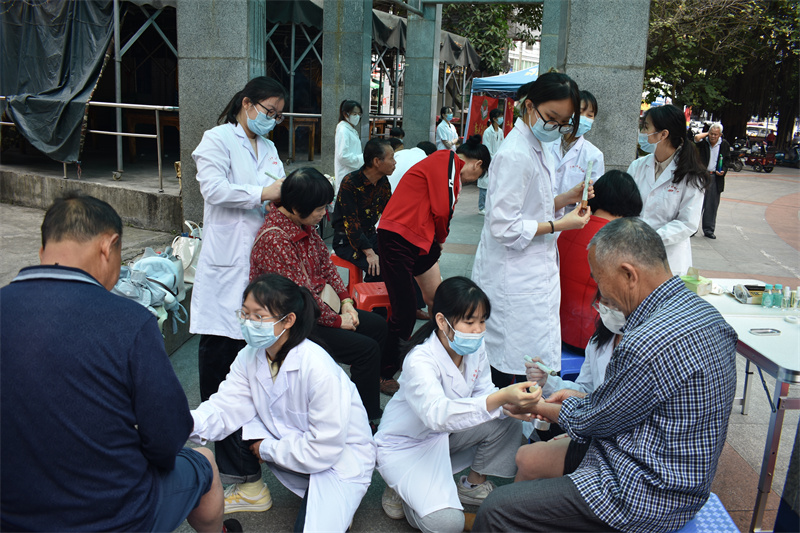 当天一大早,同学们就早早地来到义诊现场,为前来义诊的居民积极进行引导和服务。此次活动共有泌尿外科、肾病内科、男性科的专家团队参加,专家们为到场的社区居民测量血糖并提供医疗咨询服务,耐心细致地为居民答疑解惑,针对居民提出的各种症状及问题,同时结合他们的身体状况给出切实可行的建议。义诊现场还设置了穴位贴敷、艾灸、刮痧、手法按摩、量血压、中医药防治鼻炎宣讲、鼻炎保健操宣教等项目,让社区居民在家门口就能享受到专业的服务。