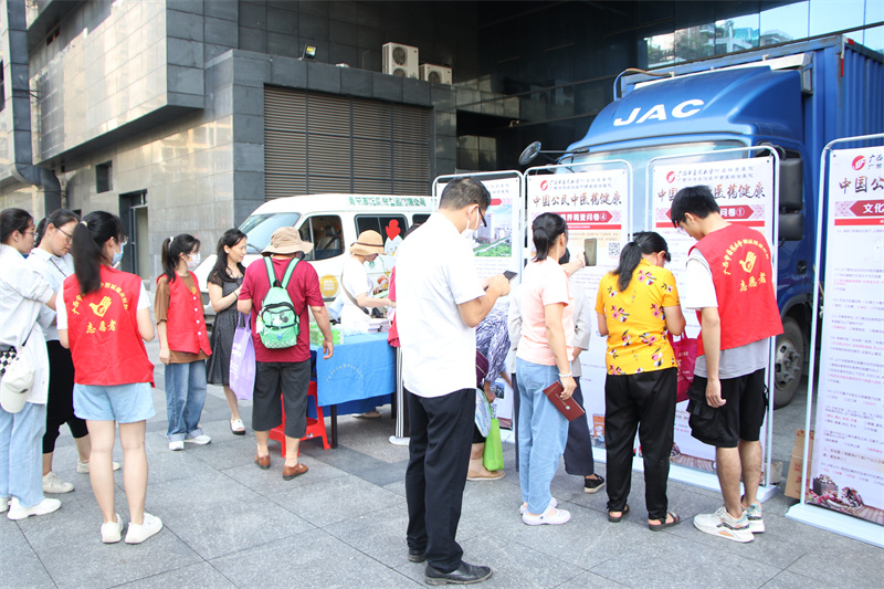 现场还通过义诊宣教、有奖问答、发放宣传册等形式向群众普及中医药健康文化知识。在有奖问答环节,群众可通过扫描二维码填写中医药健康文化素养调查问卷,不仅学习到了中医药知识,还能获得中药香囊及生活用品等奖品,来往的居民纷纷驻足参加活动,现场热闹非凡。