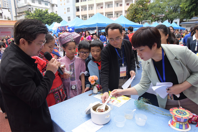 为传承中华优秀传统文化,普及中医药知识,培养青少年对传统中医文化的认同感和归属感,4月10日上午,华强路小学举办了一场别开生面的“广西三月三”传统文化我来秀活动,作为此次活动的主要板块之一,我院联合华强路小学主办的“传承药膳文化,品味舌尖中医”中医药文化进校园亲子药膳比赛同期举行。旨在让孩子们从小接受传统中医文化熏陶,了解药膳、感受药膳、认同药膳。我院中医特色办公室、宣传部、药膳食疗研发团队部分代表以及华强路全体师生参加活动。