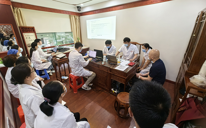 许家栋教授通过望、闻、问、切亲自对患者进行了查体,系统全面地询问病史,详细了解患者的病情信息。查房结束后,根据对该患者的四诊资料,从中医“病因病机、辨证论治、转归预后”等方面进行深入的探讨。在听取主管医师的病例汇报及参会医师讨论后,许家栋教授充分肯定了目前的诊疗方案,并在此基础上,对患者组方用药等提出了全方位且具针对性的分析和建设性指导,耐心答疑解惑,倾囊分享了其个人丰富的临证用方经验和辨治思路。