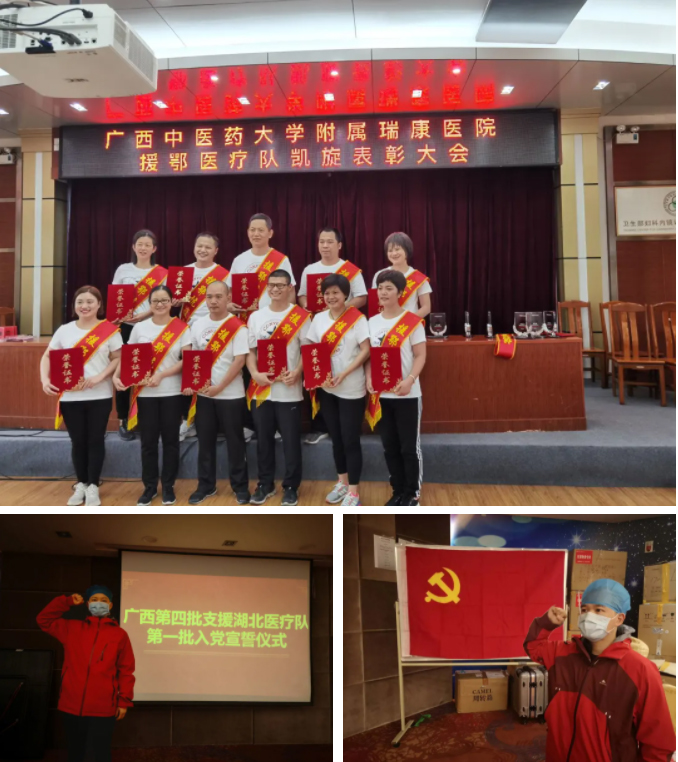 党徽闪亮,我是党员我先上。庚子年初,新冠肺炎疫情来势汹汹,内科第九党支部全员请战,发挥党员先锋模范作用和大无畏的“逆行”精神,投身抗疫一线。2020年2月12日,重症二区副主任杨益宝,护士长覃惠娟、护士罗晴作为广西援助湖北医疗队的第三批成员,第一时间抵达湖北十堰市并迅速进入到收治确诊患者的该市竹溪县妇幼保健院(新院),全身心投入抗击疫情的工作中。2月15日,支部书记唐晓率领重症医学科的6名医护人员作为广西援助湖北医疗队的第四批成员,驰援武汉沌口方舱医院,后又转战“协和西院”,圆满完成党和国家交给的任务。