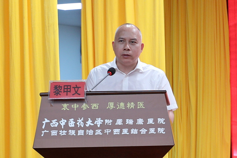 黎甲文在致辞中表示,广西中医药大学附属瑞康医院入选国家中医疫病防治队和疫病防治基地依托医院,这是对瑞康医院多年来发挥中西医结合优势,加强学科建设,不断提升中医应急能力的肯定,是对我区卫生应急力量的进一步充实,在推动我区重大传染病中西医协同防治体系的构建将发挥重要的作用。他对中医疫病防治和疫病防治基地的建设提出了几点要求:一是尽快建立健全中医疫病防治队伍的运行机制;二是要精心筹备,做好队伍培训与演练计划;三是合理合规使用国家财政资金;四是做好随时出征准备。
