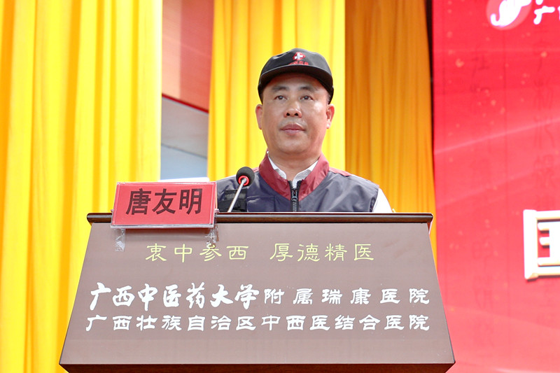 广西中医药大学附属瑞康医院院长、依托广西中医药大学附属瑞康医院国家中医疫病防治队队长唐友明在仪式上对各位领导的到来表示欢迎,对一直以来关心、支持我院工作的各级部门表示感谢,并向全体国家中医疫病防治队队员致以敬意。他介绍说,广西中医药大学附属瑞康医院一直高度重视医疗应急能力提升,抗击新冠肺炎疫情工作中,我院迅速成立中西医结合专家组,全院1000多名医务人员踊跃报名“战疫”,其中23位杰出代表披甲逆行,奔赴湖北抗疫一线。全院上下充分发挥中医药优势,坚持中西医并重,发挥中医药在传染病防治的独特优势和作用,在援鄂、援边、援外等疫情防控工作中做出了应有的贡献,展现了中医疫病防治的独特优势。他表示,我院定会认真总结新冠肺炎疫情中医药防治经验,加快提升中医药疫病防治能力。依托医院建设的国家中医疫病防治队伍必将茁壮成长,努力练就过硬的本领,形成强大的战斗力,充分发挥中医疫病防治优势,真正做到“召之必来、来之能战,战之必胜”,在新发突发传染病防治和公共卫生事件应急处置中发挥关键作用,成为国家中医应急医疗队伍中重要一员。