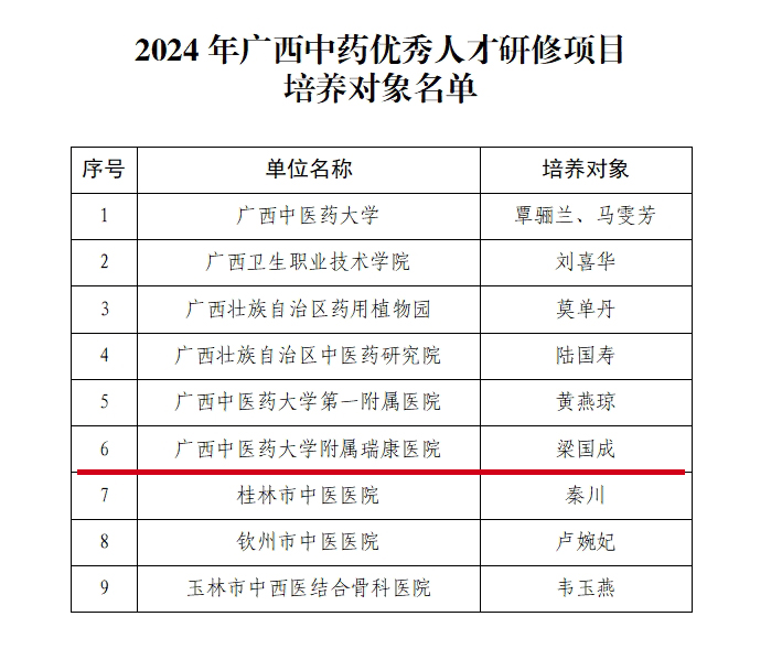 近日,自治区中医药管理局公布《2024年广西中医药优秀人才培养对象名单的通知》,我院宋杰、杨红梅、梁明坤入选2024年广西中医临床优秀人才研修项目培养对象,梁国成入选2024年广西中药优秀人才研修项目培养对象,并获得2024年广西中医药优秀人才研修项目经费支持。
