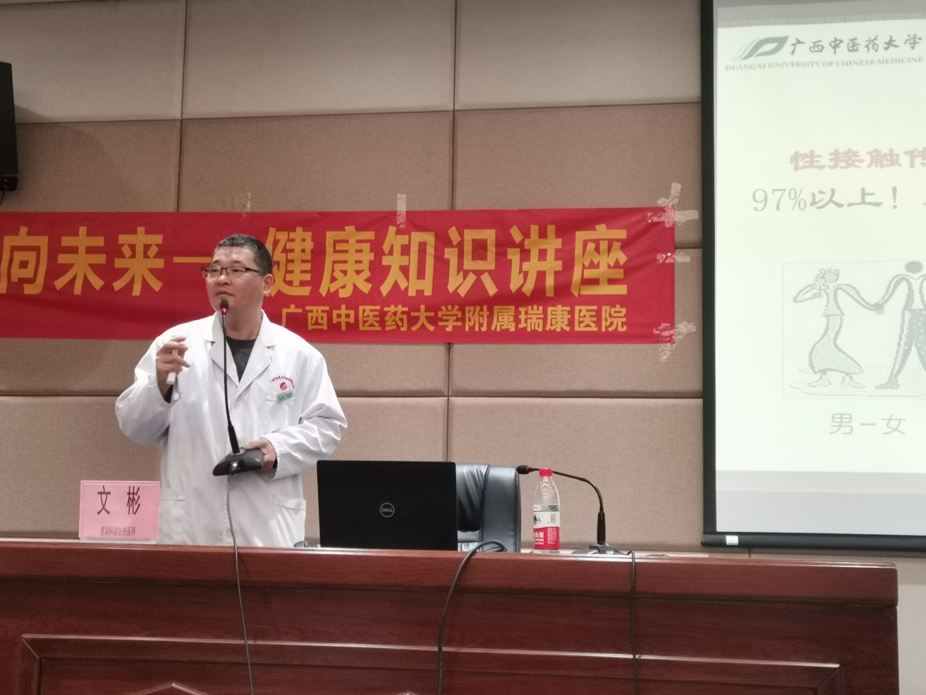 11月25日,艾滋病研究中心办公室联合医疗服务部到广西职业技术学校开展了一场“防艾”健康知识大讲堂。文彬副主任医师做了艾滋病基本知识的讲座,期间跟同学们积极互动,进行趣味有奖知识问答,现场气氛热烈而活跃。活动进一步加深了同学们对防艾知识的理解与掌握程度。