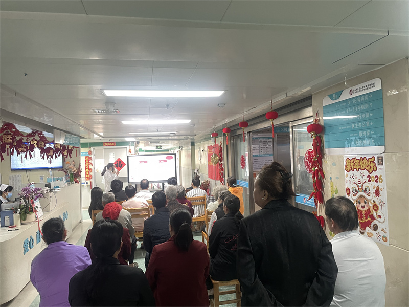 活动在温馨的氛围中拉开帷幕,科室护士长王艺代表全科医护人员,向患者及家属致以节日问候与美好祝愿,希望大家在活动中学习健康知识、感受医护关怀,在病房里度过安心、暖心、舒心的元宵佳节。在健康科普环节,支部充分发挥党员业务骨干的先锋模范作用,冉龙娇医生结合临床案例,用通俗易懂的语言讲解了慢性肾脏病日常管理、科学饮食及规范用药等知识,帮助患者树立科学的疾病管理理念,增强战胜疾病的信心;针对血液透析患者的血管通路护理需求,唐定芳护士开展动静脉内瘘护理专题指导,通过现场示范与一对一讲解,切实将专业医疗服务延伸到患者的日常照护中,体现了党员医护工作者的责任与担当。