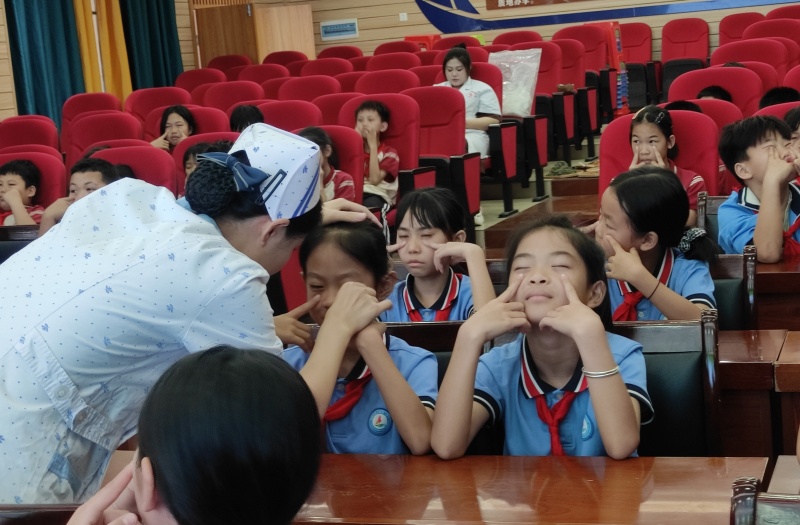 本次活动以“‘艾’护眼睛,‘睛’彩未来”为主题,结合全国近视防控宣传教育月与清明节气养生,把“清明食艾,明目养肝”的中医智慧带到孩子们身边。治未病科曾萧仪医师以《“艾”护眼睛,“睛”彩未来》为题,结合中医“肝开窍于目”理论,讲解艾叶明目养肝功效,分享适合青少年的护眼小知识。视光中心黄滟媛护师以《“艾”护眼睛,“睛”彩未来》为题,用生动有趣的语言,讲解近视危害、科学用眼习惯,并现场纠正眼保健操动作,手把手教孩子们正确护眼。医生们现场教学睛明、攒竹、四白、太阳穴等护眼穴位,轻柔按压、找准点位,孩子们一学就会,居家也能轻松护眼。