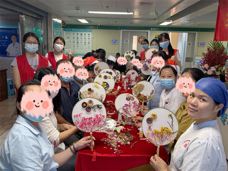 活动最后是充满雅趣的永生花团扇DIY。社工首先介绍了工具用法,随后患者们在医护与志愿者的耐心协助下,化身“花艺师”,随心搭配色彩斑斓的干花,将其小心翼翼地粘贴在素扇之上,赋予团扇全新的生命。看着手中独一无二的精美作品,大家脸上洋溢着成就感,彼此展示、拍照定格,空气中弥漫着温馨与喜悦。