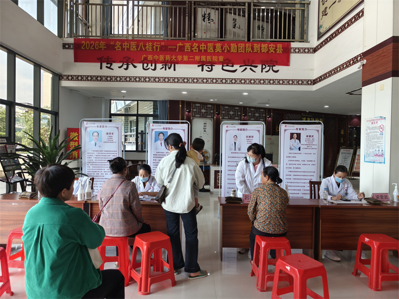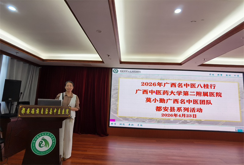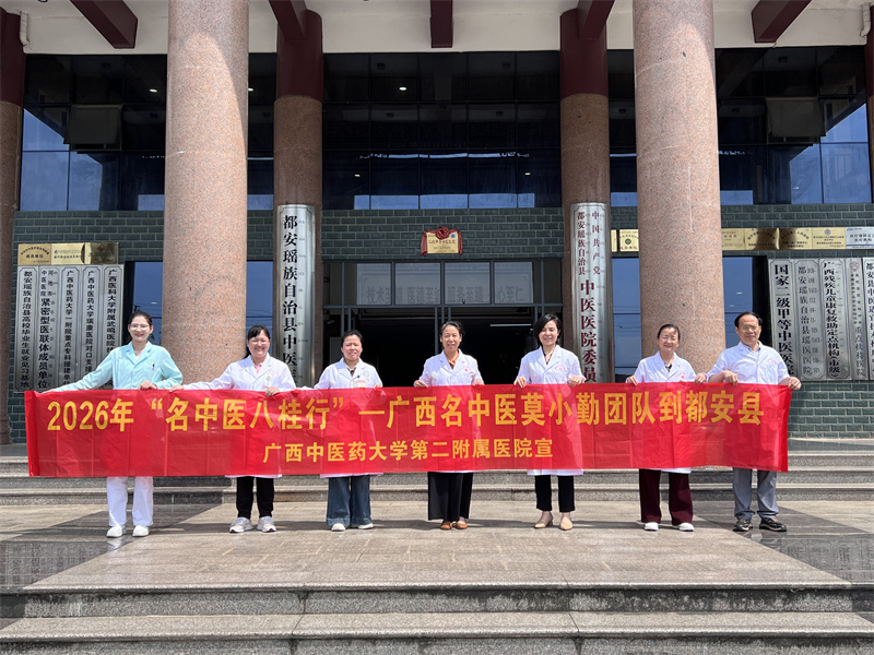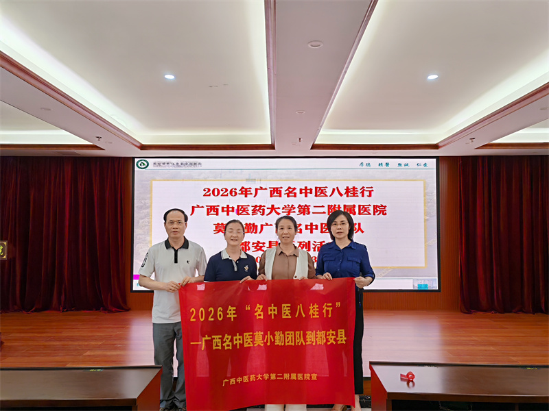 为推动优质中医药资源下沉基层、助力县域医疗服务能力提升,4月23日至24日,我院广西名中医莫小勤教授团队赴都安县中医医院开展2026年广西“名中医八桂行”活动。本次专家团队阵容雄厚,由广西名中医、乳腺科技术主任、主任医师莫小勤,乳腺科主任、主任医师吕丽琼,广西名中医、内分泌科及风湿免疫科病区技术主任、主任医师庞学丰,广西名中医、呼吸与危重症医学科副主任、主任医师梁爱武共同参与。活动期间,团队有序开展学术讲座、教学查房、疑难病例研讨及公益义诊等多项帮扶工作,切实发挥名医引领辐射作用。